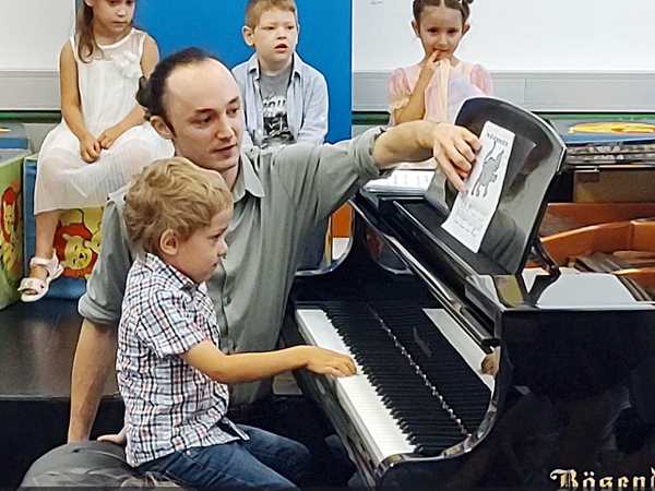 After the three songs were over, they sat back down, and the director called them up one by one to sit down at the piano and do their songs. The other two kids came first, then it was Emmy's turn. He had played the song well before. At first, he was so far away from the piano that he couldn't reach it, but then the teacher moved him closer, and he started playing. Both kids could play their songs by heart, but the teacher pointed at the notes. One major problem was that the piano did not have the colored dots on its keys so they'd know where the keys they were looking for were. That's where the teacher (who wasn't theirs) came in handy, as he pointed the right keys out to them. A few times Emmy didn't push the key hard enough, so that the tone could not be heard. And he made a few mistakes, but given the situation and the nervousness, he did alright.