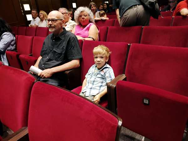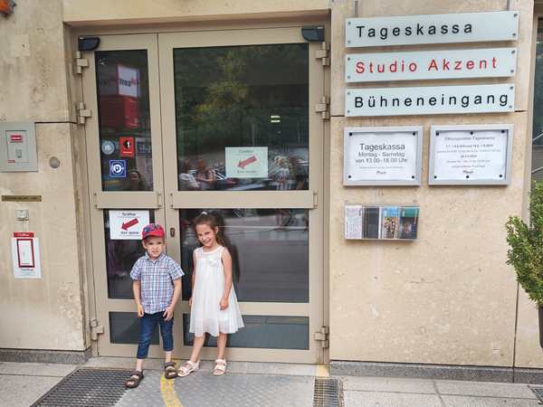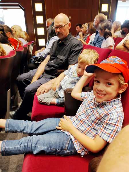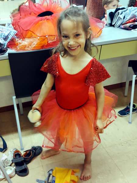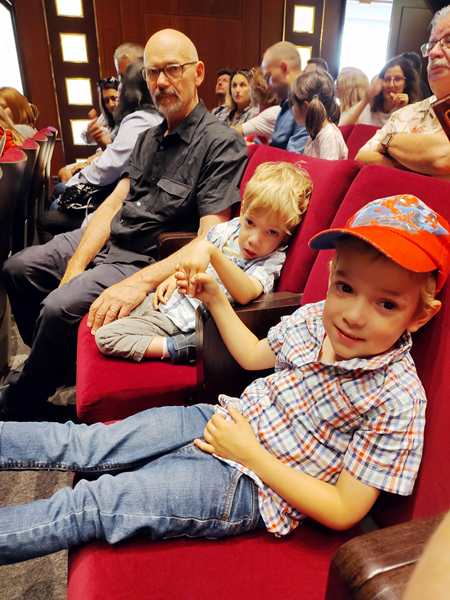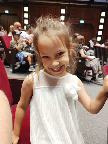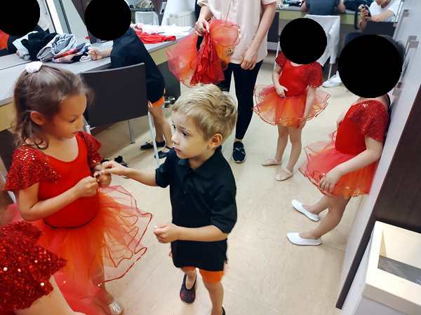 Sammy soon started getting pretty antsy, and so Randy left the room with him. However, there were only about two dances left before the break. As soon as it was over, I left the room and the theater to go pick up Tammy and Emmy. I found them already completely dressed and ready to leave. They were beaming. They said good-bye to everyone, as it was the official start of the summer break for dance school, and then we left and rejoined Randy and Sammy in the theater. After a few minutes the bells started ringing, indicating that the second half was about to begin. Emmy couldn't wait to get inside the theater. All five of us then sat down on our seats. Sammy wanted to be close to his brother, and they were holding hands for a while. Tammy was sitting on my other side. And then the program started. Tammy and Emmy were very interested and watched everything closely. They were clearly impressed by what they saw. But Sammy was getting more and more unhappy, and so Randy left with him. However, he got worse outside, when his tablet didn't have internet for him to have his kids' songs going. He started crying and screaming his heart out. There was nothing Randy could do but wait for the program to be over and us to come out.