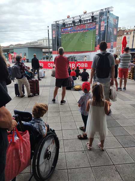 We started the long walk to the train station. Tammy soon started crying because she wanted me to carry her. I told her I could not. She's too heavy now. And so I held her hand and continued walking. She cried all the way to just before the train station, where I saw a bench and sat down with her. I held her, and she soon calmed down, and from then on, she was fine. We were able to continue walking to the train station. Emmy needed a bathroom, so we went to the one at the train station. But after that, we still had quite a bit time before our train was to leave. We went outside the main entrance to look at the huge screen they had put up so they could show the European Soccer Championship matches there for anybody who wanted to watch. We looked at it for a minute, then we turned around and went back inside. We headed to our platform, where our train was already sitting, even though it was still 15 minutes before it'd leave. We got on and sat down. By 4:15 pm we were back home.