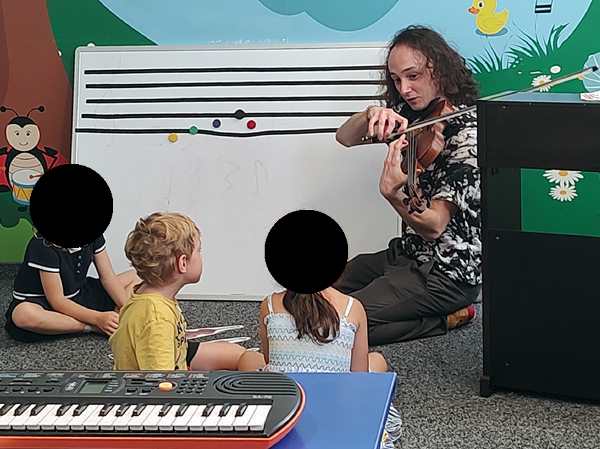 Then he got his violine out. He's actually also the violine teacher at that music school. He reviewed all the string instruments with them and showed them what you can do with a violine. And then it was finally story time, which always comes at the end. Emmy got his sticker, and even though it was not his last class, he also got to pick a gift out of the treasure box. He chose a party trumpet, where the paper extends, when you blow into it, and was very happy about his choice. He'd soon torn the paper, which made the trumpet louder, which is actually what he wanted and made him happy.