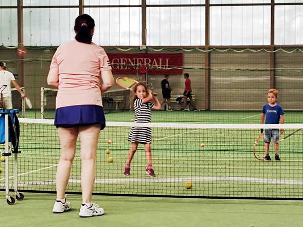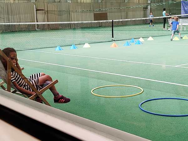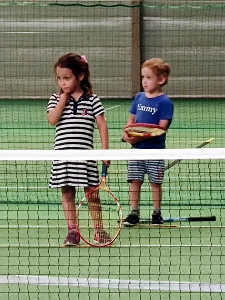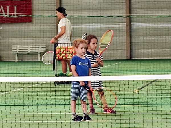 We still had to walk down a long road to get to the sports center. Emmy was so tired that it took him a while to be willing to use his scooter again. And then we ran into Randy and Sammy who had come to go to the playground by the sports center. We each continued on our way. Tammy and Emmy got changed, then we headed to the tennis courts. We were a little early. Normally their class is at 2 pm, so they'd missed it, and the 4 pm class was their make-up class. But I wished there had been another day where they could have done it, as they were way too tired. Tammy didn't want to play at all. She said she was just gonna sit down on the floor. I had told the teacher that they were tired, but he wasn't even the one teaching them today. It was the trainee, the same lady as last week, who did the whole lesson with them.