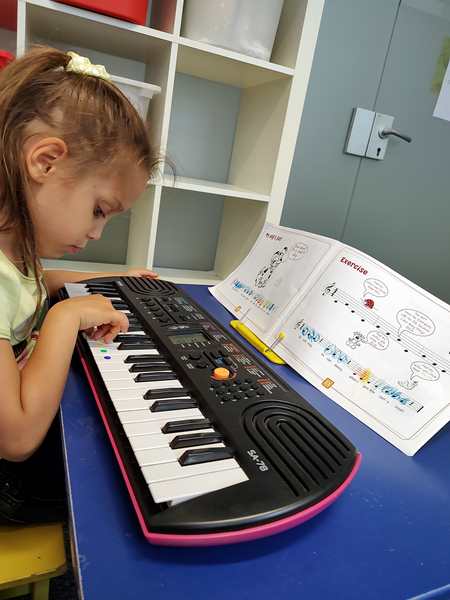 She started with the greeting song, then gave them the colored stickers to put on the keys of their pianos. Then they played a song together that was in their books and that was a little more challenging. I tried to help them both, but that was a little hard to do. Emmy did not have a good day and was hard to motivate.