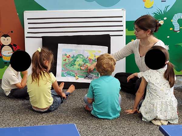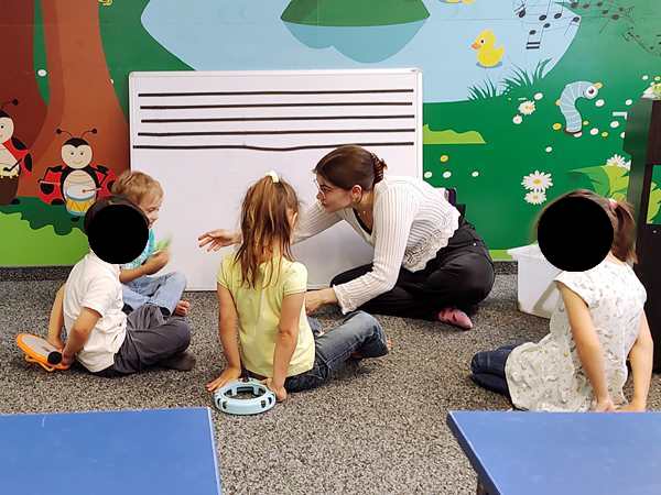 After playing the piano, she called the kids to the front. She did a freeze dance with them and had the kids play the piano and stop, and then everyone had to freeze. She did that game for quite some time. Then she did the song with them again, where they hide little instruments and have to respond to her sung question with a sung answer. TIme went by fast, and so it was already time for the story at the end.