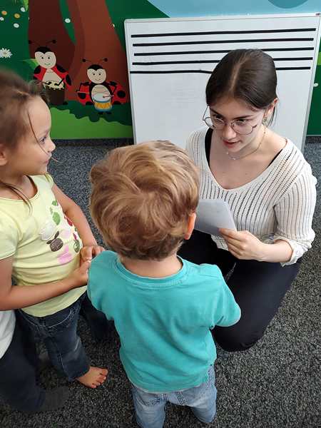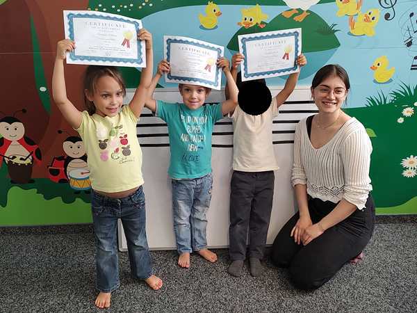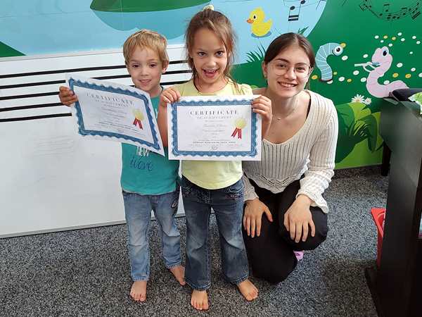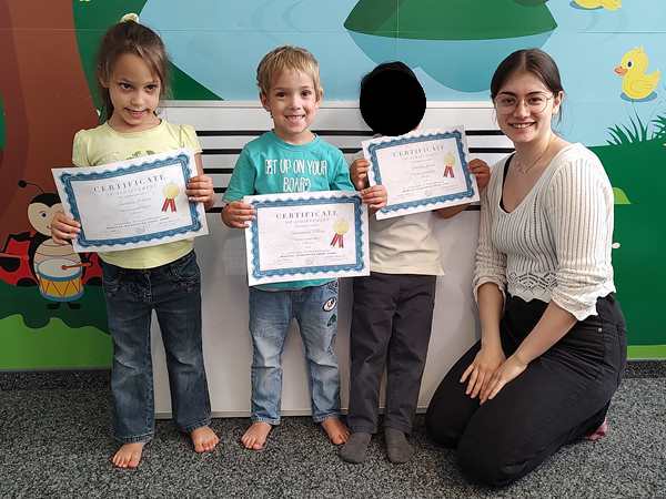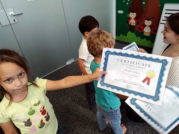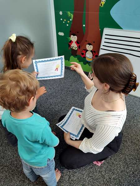 After the story, it was time for the stickers, as always, but this time there was more. She handed them their certificates, and we took pictures of them. Emmy's friend was also there for the last time, even though there is one more class next week, and so he also got his certificate. Later she also gave us their report cards.