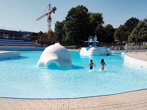 This morning we had to leave the house early for their very last swim class this academic year. Again, there would have been another one next Sunday that they're going to miss because we leave Vienna on Wednesday. We left the house at 8:45 am and took the train just before 9 am. After the train, we took the tram and then walked to the swimming pool. There were considerably more people there than last time, as it was warmer, though there was a cool breeze that early in the morning. We paid and walked to the locker rooms, where we changed. There was still time until our 10 am class, and so Tammy and Emmy ran into the water and played in it. I told Sammy he could go in the water after the class. We were concerned he'd be too cold if he went in before the class.