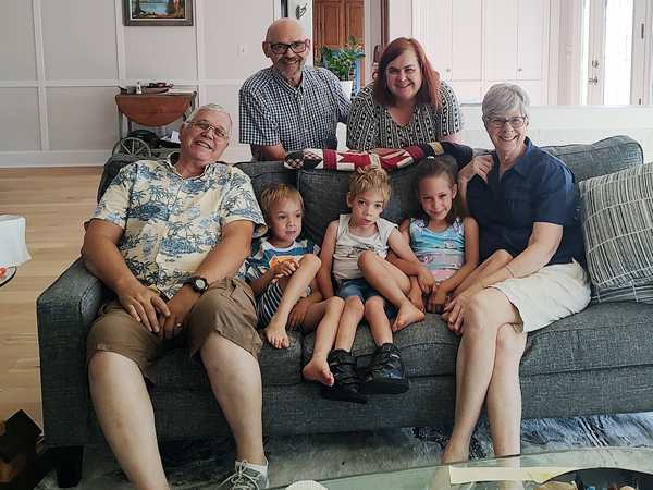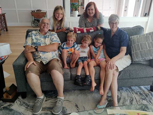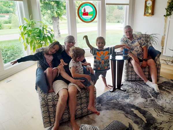 I got up after I was woken up. I was very tired but I started packing. I wanted to get that done first before sitting down for breakfast. The others had all eaten already. After I was done packing, Randy loaded the car up while I sat down at the table and ate their leftovers. While I was eating I was watching the kids play and have fun. Sammy loves the Grandma in the house, and after we had left there, he kept asking when we'll be back to see her. We took a group picture, then it was time to say good-bye. At 10 am we left, all waving hard at each other.
