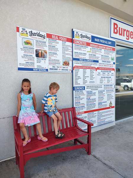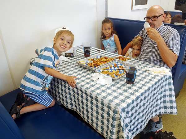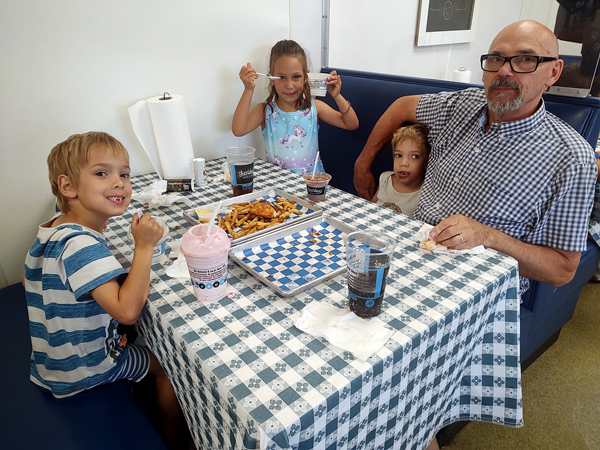 They had a small dining-in area, and we occupied a booth. I ordered, then we sat down. Soon three big trays of food came - lots of the best fries I've eaten plus two cheeseburgers and chicken strips that were also delicious. We ate then we got our icecream/frozen custard. We all enjoyed it.