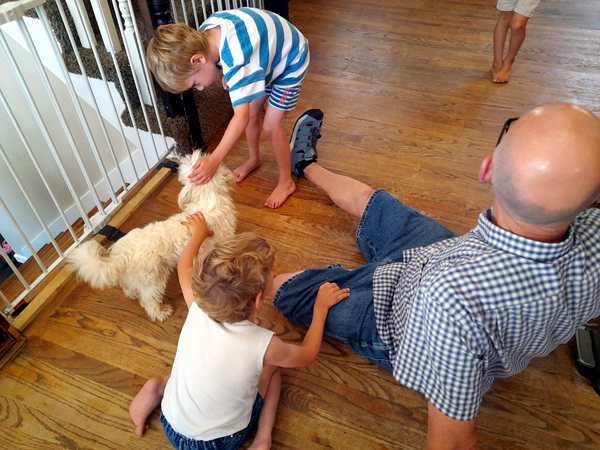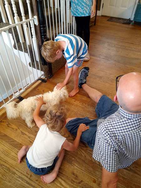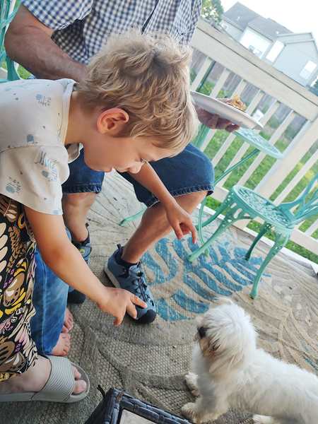 Before we left there, the kids noticed a dog in a transparent box with holes at the neighboring table. Emmy started playing with the dog and putting his nose to the dog's nose as he was putting it into the hole.