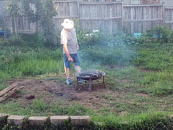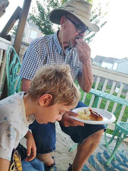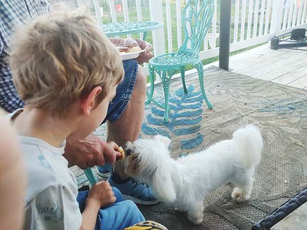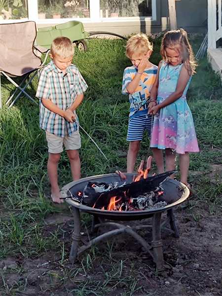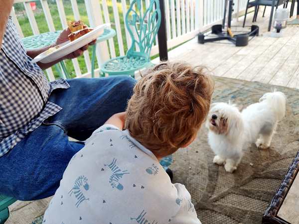 Soon they also returned inside, got dressed and left again to have fun with the four kids of the house. Then I was called as they were grilling hot dogs in the fire. It was a first for the kids who were holding long metal sticks with the sausages on them into the fire. Then we actually ate them. Sammy was more interested in the dog and the cat than the food, and he was allowed to feed the dog some bread.