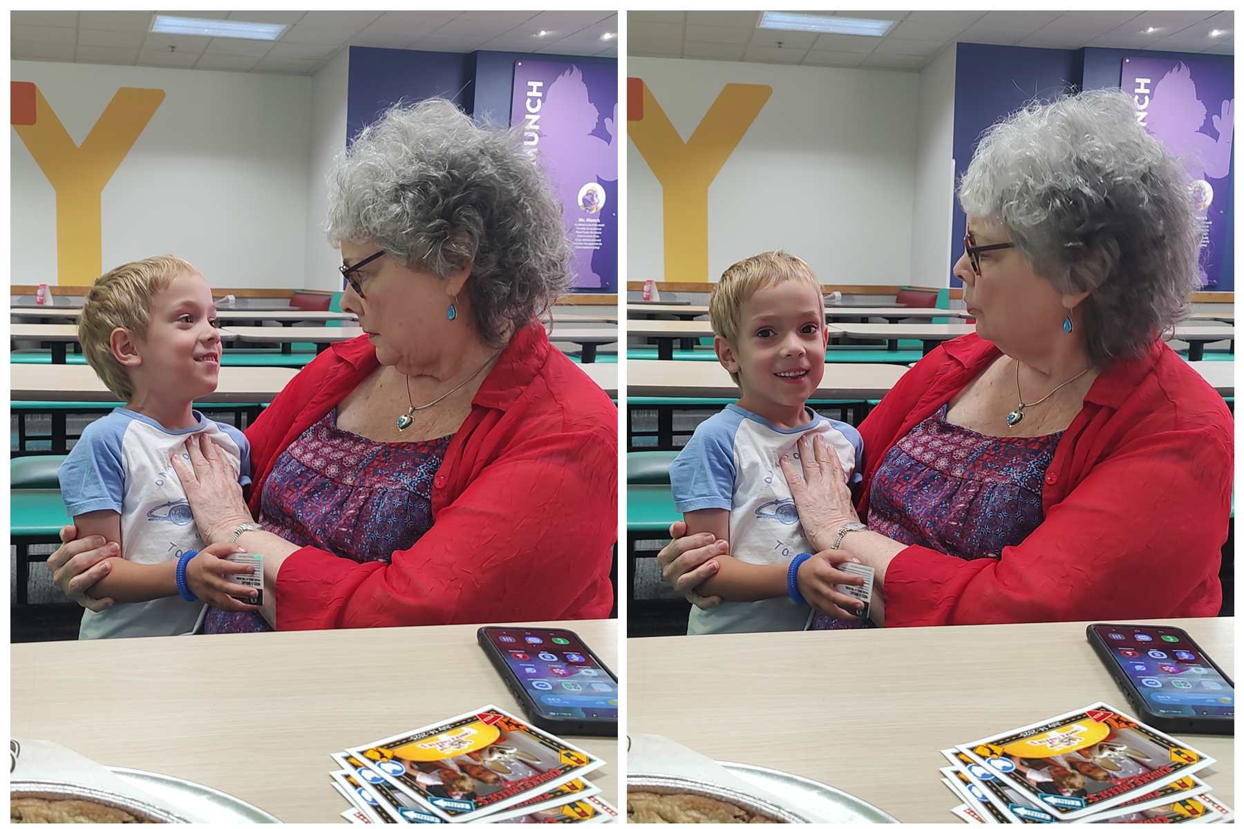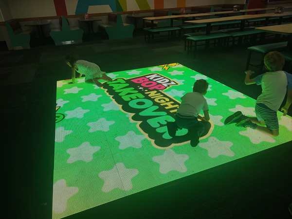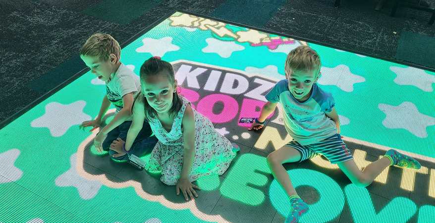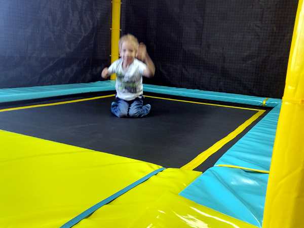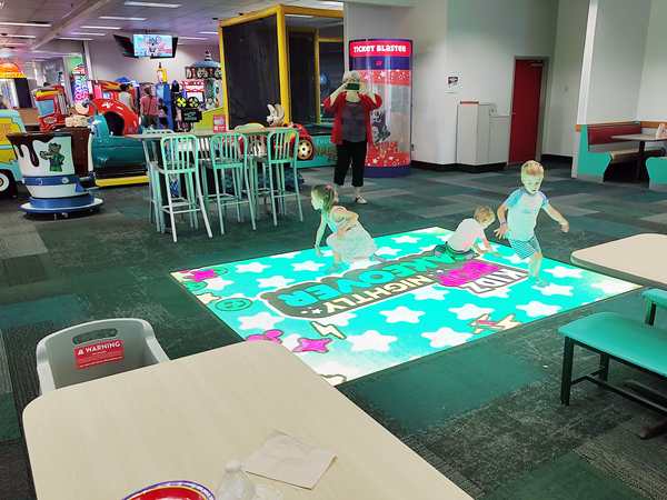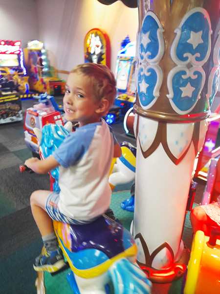 My friends and I sat down, while Randy was Sammy's hands and feet and was taking him to the rides he wanted. I enjoyed catching up with my friends. It took quite a long time but then the food was finally ready, and we all got to sit down and eat. As soon as they were done eating, they ran off again to keep playing. Emmy was actually counting how many points he was using and choosing more carefully which ride to do. In any case, their 20 points were soon gone, and the trampoline was the only thing left to do for them. They also had a screen on the floor that was reacting to touch, so the kids (including Sammy) were chasing the stars etc. that were coming up. Tammy kept coming to us with pictures from one of the rides, and my friends took pictures of those pictures while I photographed one of them.