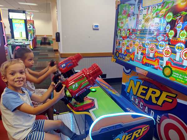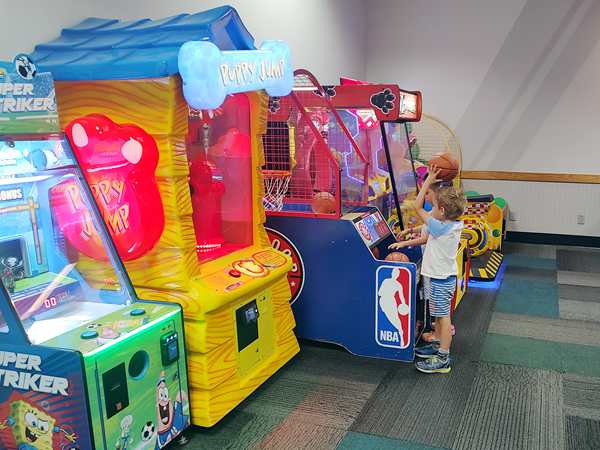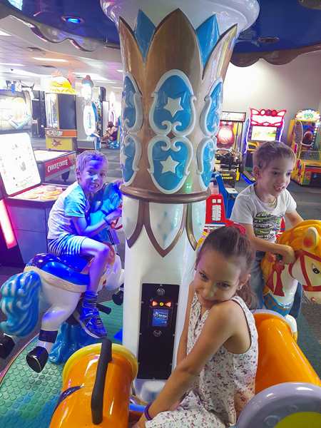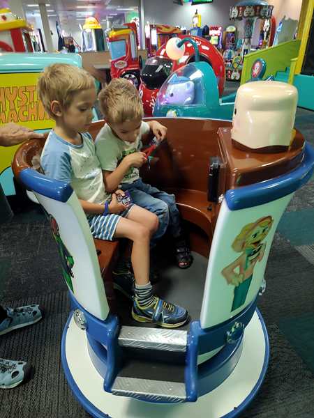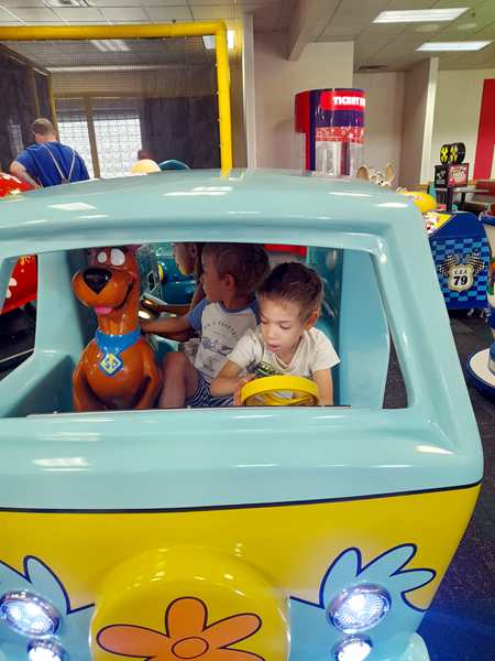 It was very empty so we had plenty of tables to choose from. We ordered two pizzas, and the kids got cards with 20 points each to use on all that was in the room. There was also a trampoline for them to use. They immediately ran off to start doing the rides and had lots of fun.