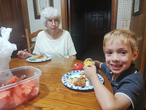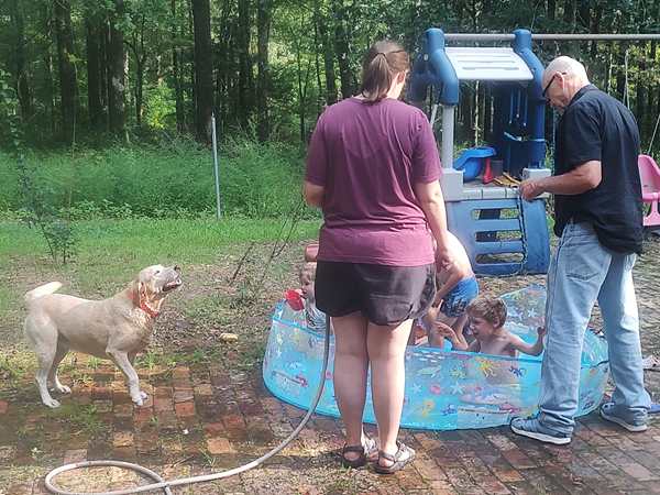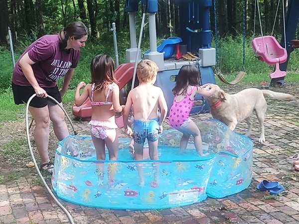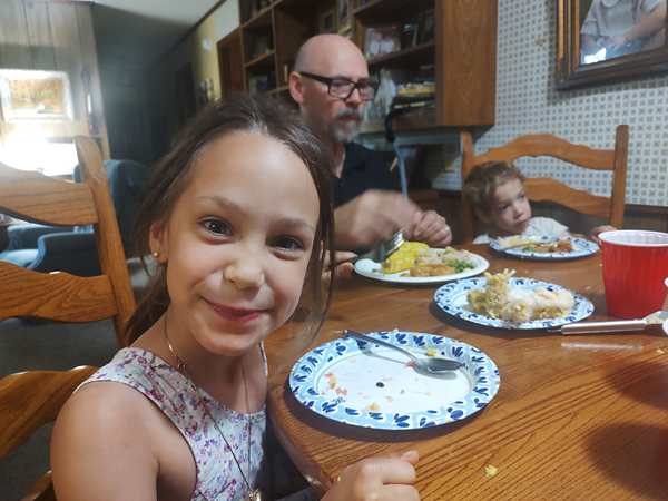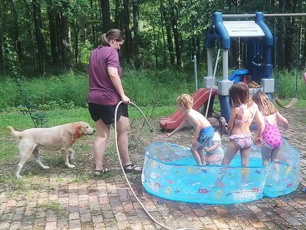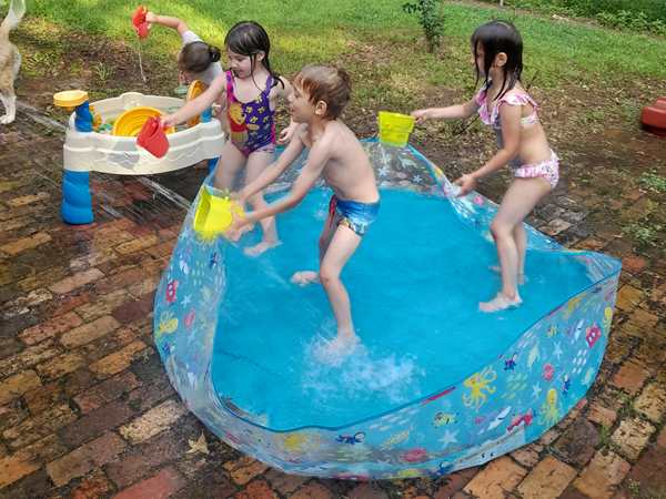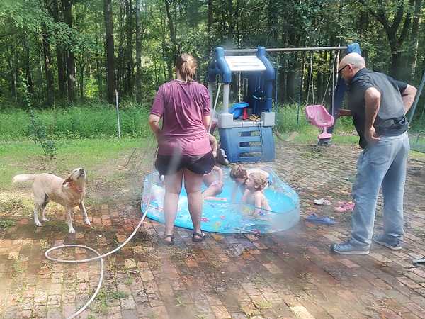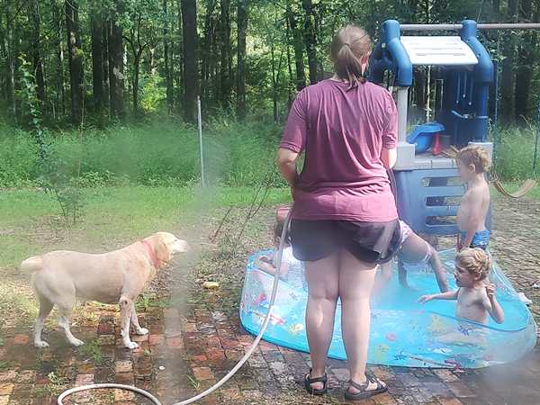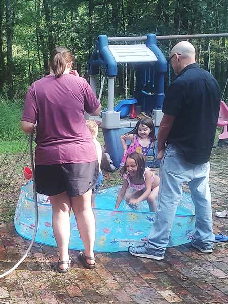 We then had lunch pretty early, sandwiches that everyone enjoyed. Then the kids continued playing, while I went back to work. At some point in the afternoon we returned to the house, where we stayed for the rest of the day. Randy's youngest adult daughter made spaghetti for everyone to eat, then the kids were eager to go outside and play in the water, given how hot it was. I helped them put their bathing suits on, then they went outside. I stayed inside and was watching them from there.