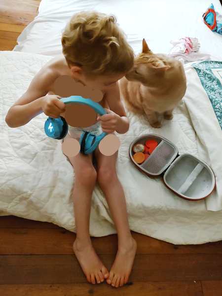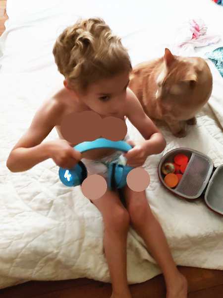 The boys have been scared of the dogs at both houses. Tammy was at first as well but not for long. Sammy was terrified when the dog also wanted to have some water fun. Whenever he'd come near, he'd scream for Mommy or Daddy. He was not having fun. After watching for a few minutes and feeling bad for Sammy because Daddy was distracted and not noticing, I went outside to rescue Sammy. He was extremely thankful. I carried him upstairs to our room and gave him a new diaper. He then got his headset out to listen to music. The cat came by as she likes the room we're in, and Sammy had a good time with her. He was a little fearful at first but has pretty much lost that already as it's a very loving cat.