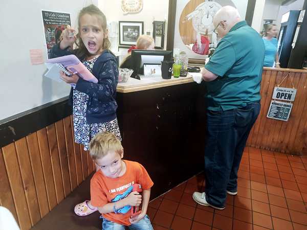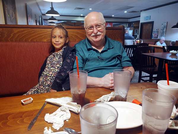 We drove the half hour northwest to the little café that our friends had suggested. We saw the husband right away and found out that his wife was sick and couldn't come. I was really sad as they are good friends of mine, and I wanted to see them both. We sat down in a booth and ordered our food, then started talking. Randy and the kids all ordered breakfast dishes, and as the kids were hungry, they all ate well. Their tablets were all out of juice, so it was harder to keep them happy. Tammy and Emmy had our phones to play with.