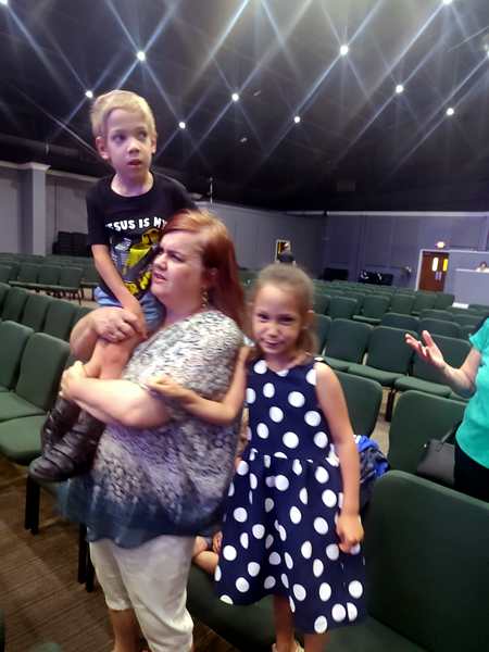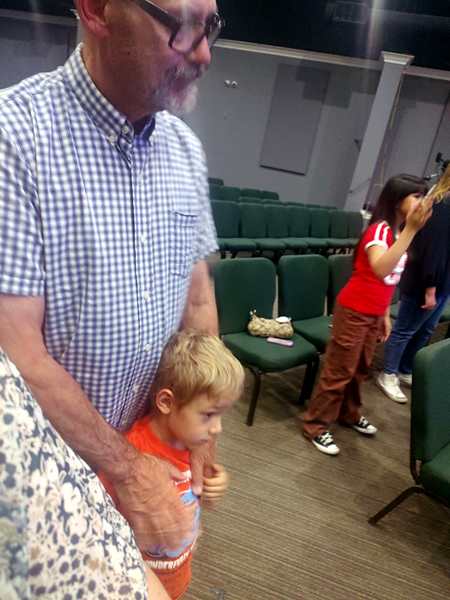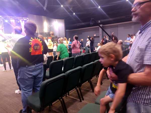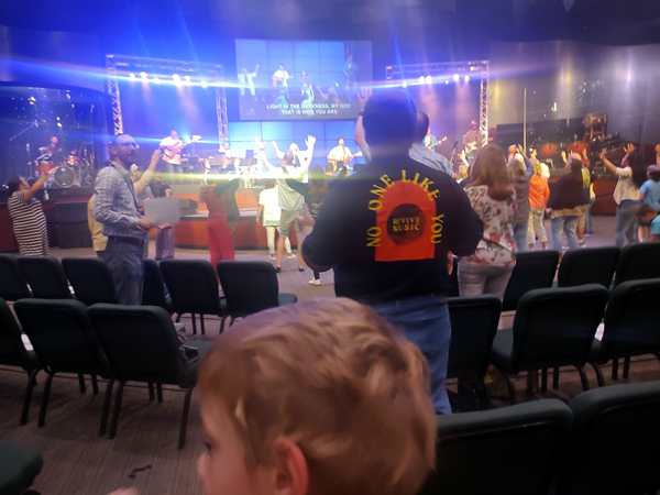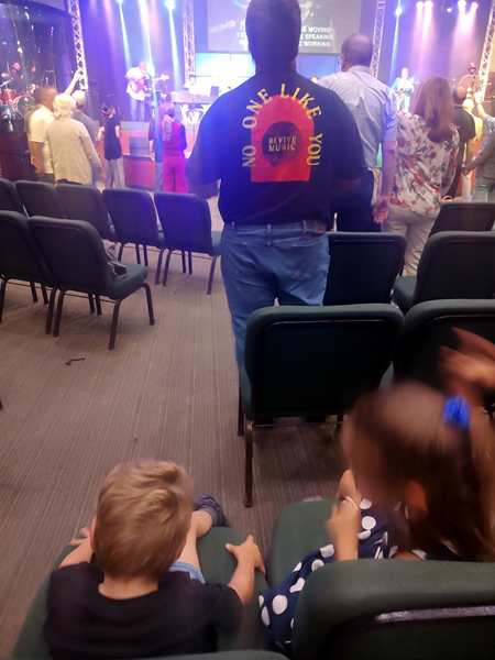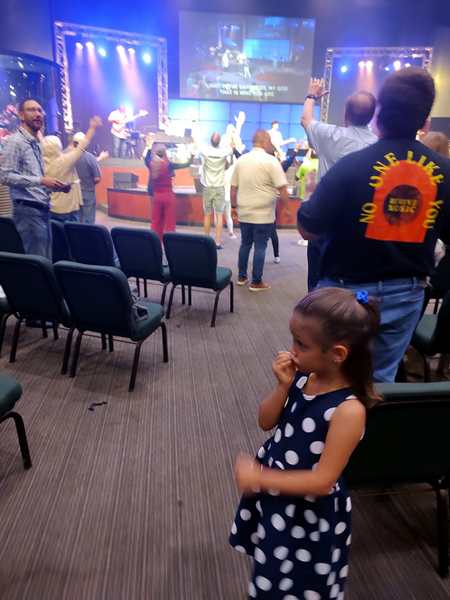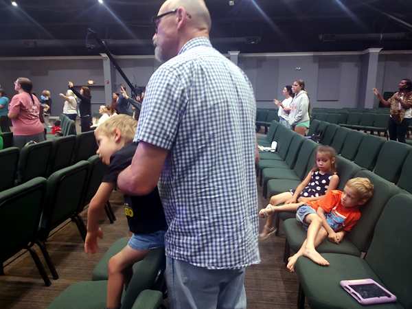 I noticed right away that there weren't too many cars in the parking lot. We went inside, and some people greeted me right away as they recognized me. Then we found ourselves some seats as the service was starting. Sammy got into the music right away as the first one was a song he knows well. The other two were less excited. I was holding up Sammy for most of the time and couldn't get the others to participate in worship.