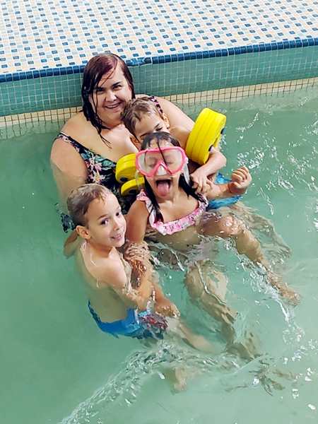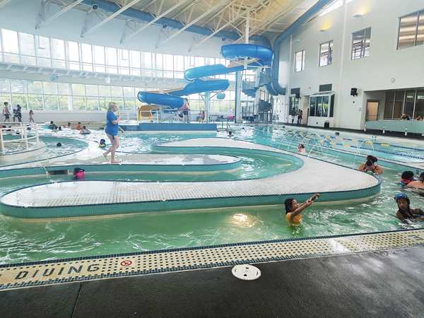 We paid $18 for the five of us, then walked into the family locker room where we got changed. We took all our stuff into the pool area with us. They had a shelf set up for people to put their stuff on which we did.