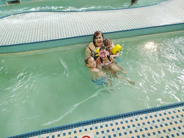 The kids were really excited to be there and didn't know where to start. We walked to the little playground but they wanted to go on into the deeper water so we did. It was rather cold, like the pool in Austria, but it lots of different areas. They had a lazy river, where there we water was moving and moving people along, and they had water come down from the top in some places. I was playing with the kids as we went through there, and we had lots of fun. We went through there quite a few times. They also had a round area where the water was moving even faster going round and round, and the kids were enjoying it too.