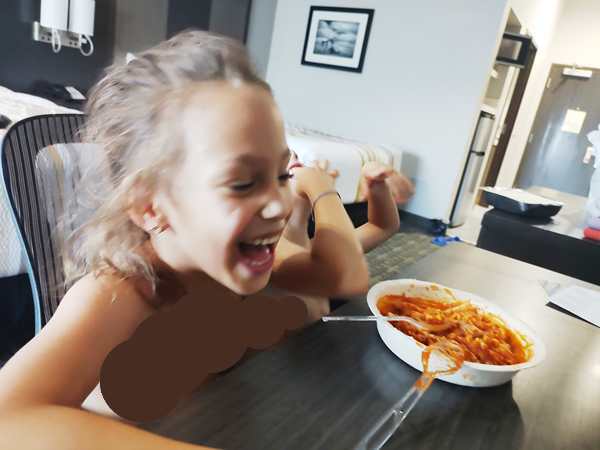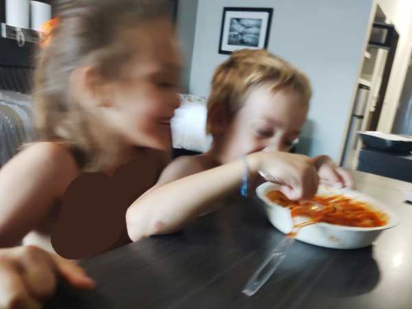 I put the pasta into the microwave, then the lasagna. Tammy and Emmy both wanted the pasta, so they sat on the chair together. However, the laughing and fun didn't end well so I separated them and let them eat one after the other. Once the lasagna was ready, I could put some on a paper plate so they could all eat at the same time. It was the perfect amount for all of us.