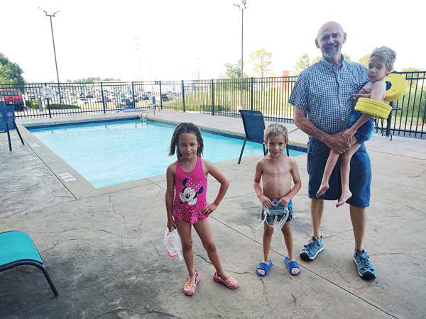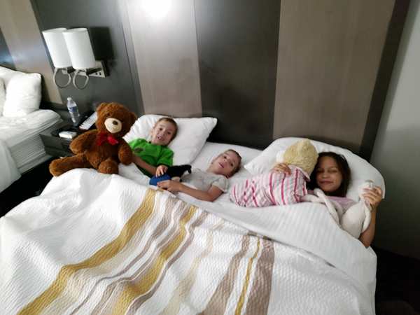 Then the kids couldn't wait to put their swimsuits on so we could go to the hotel pool. It wasn't big and it was outside. We hopped into the not so warm water. It was quite windy which made it feel cooler. It had rained a lot so that the temperature had dropped. We had lots of fun in the water. Then we got out and returned to our room, where we took a hot shower before the kids put their pj's on. It was 8 pm but I still read them a story. Then I prayed for them, and the three of them went into the one queen-sized bed, Sammy being in the middle. It was close to 9 pm before they fell asleep. I then turned my computer on to work on the pictures and write the report. However, I was getting so tired that I could not go on any more. It ended up going on 1 am before I went to bed.