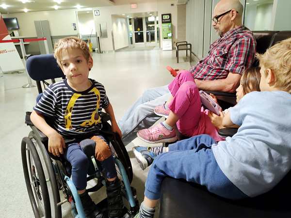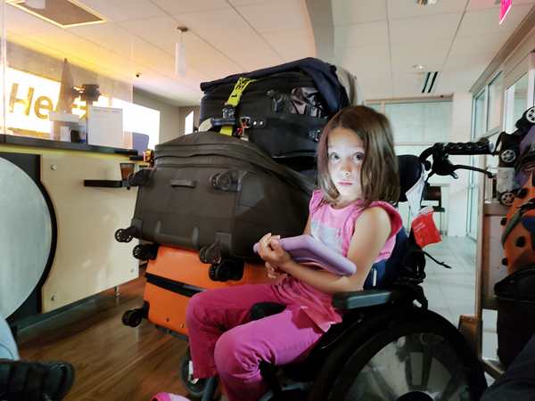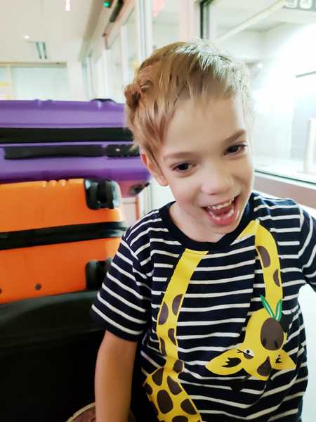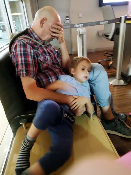 At 5 pm a Hertz guy showed up and told us we couldn't be where we were. He said he had forgotten to lock the doors last night (God's gift to us) but we'd have to wait elsewhere until they open up at 7 am. So we packed up our stuff and moved to where all the regular rental car counters were. Some rental car companies already opened up at 5 am, so we could go inside and sit down on the seats there. All three kids were running around and playing hard. Sammy enjoyed the automatic doors the most.