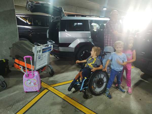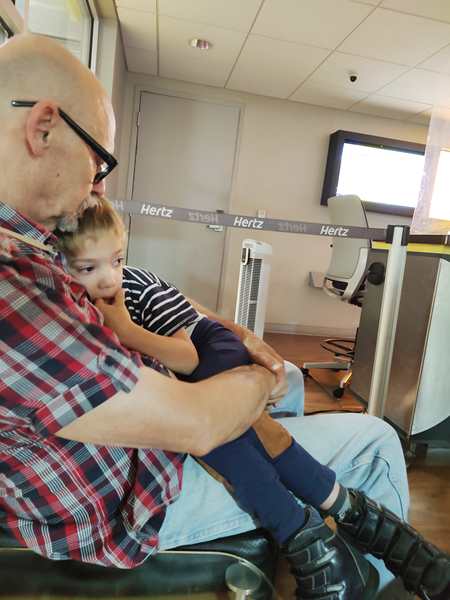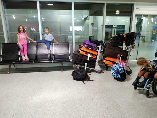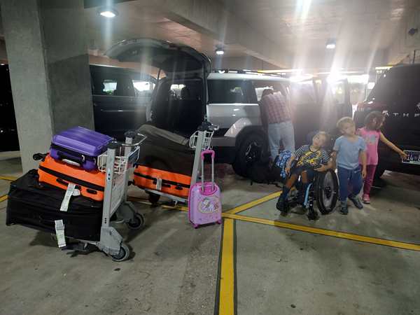 At 7 am we walked to the Gold Hertz counter where someone was already at the desk. He told us where our car was, and that was it! He didn't even respond when I mentioned that we were supposed to pick it up at 11 pm and had to spend the night there. We got our two carts and all walked to the car. It was a nice, big car, a Hyundai Santa Fe. The long process of opening the three suitcases with the car seats, putting them in, then loading all our luggage into the car, started. It took about 45 minutes. Then we got in ourselves and pulled up at the exit where we showed our driver's licences and got our contract. Then we finally left the airport.