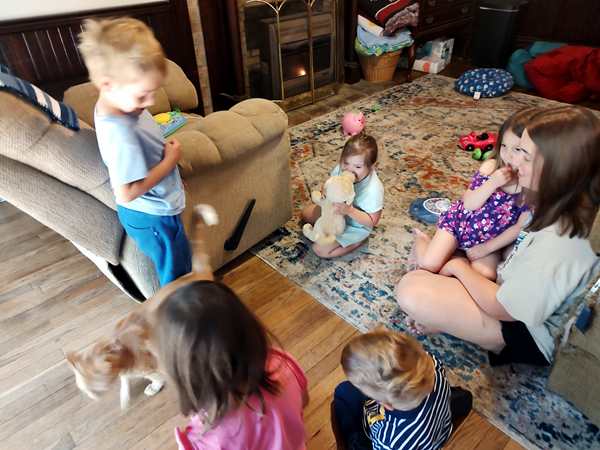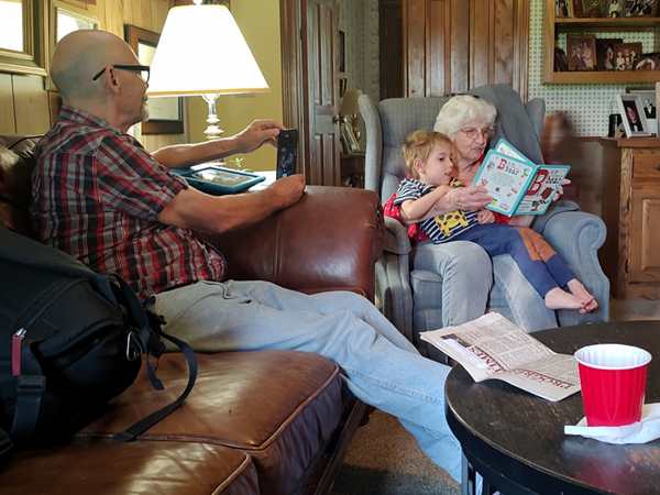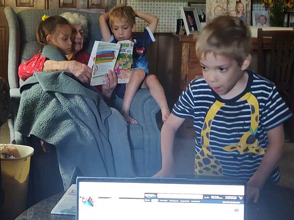 At 10:36 am we pulled up at the house Randy built where his youngest adult daughter lives with her family. They have a big dog, and the kids are all afraid of him. I carried Emmy inside, while Randy carried Tammy who we had to wake up, then we got Sammy. They were excited to see their half-sister and nieces and started playing with them right away. Randy unloaded the car and carried the suitcases upstairs, while I started arranging them and opening them up. The kids were ready to put summer clothes on and changed right away, as did I. Once we were all done, we took what we needed and piled back into the car to drive down the hill to where Randy's Mom lives. She was excited to see us all. Randy's daughter and grandkids also got there a few minutes later, and Tammy, Emmy and the older niece started playing hard with each other. They were having lots of fun. Sammy had his beloved Grandma read some stories to him. Later, once the nieces had had to leave, she also read stories to Tammy, and briefly Emmy.