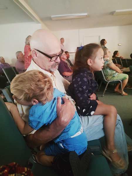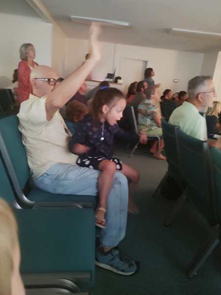 It's not a church like most churches we go to; it's very unique in every way. They started with a song, then there were announcements and the pastor was teaching. Sammy was saying "amen" all the time which was just the cutest. We were also pointed out and greeted. Then they played several songs. The kids were starting to get bored. After the songs were over, the pastor started speaking again for the offering, and our friends we're staying with and Randy left with the kids to take them to the kids' room. The kids had fun there, playing hide and seek and other games. The wife returned to the sanctuary and stayed with me.