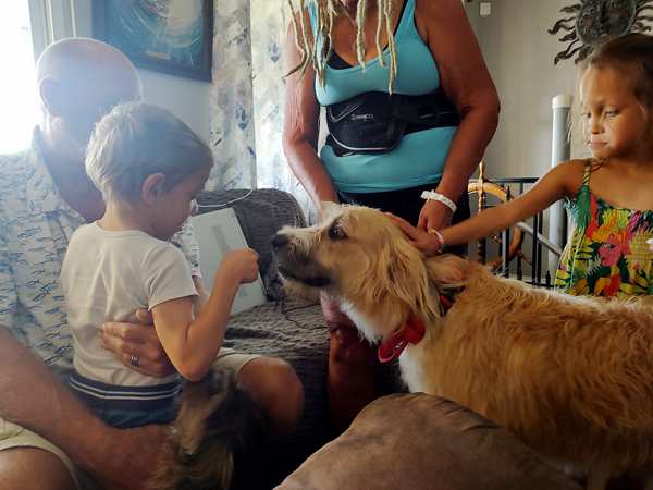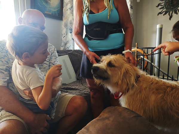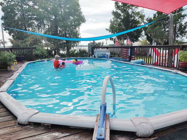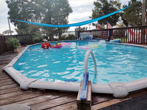 It was great to see hour friends again who we had also visited two years ago. We went inside and sat down with them while Randy unloaded the car. The kids were intrigued by the dogs especially the new, big dog, and had fun petting them. After Randy was done, we went into the trailer that is going to be our home these next few days to put our swimsuits on. It was finally time to go swimming - much to the kids' delight. We got changed and went straight into the pool where we had lots of fun. At one point I got out and sat down on a chair as I was very tired. I took some pictures while there while I was watching them.