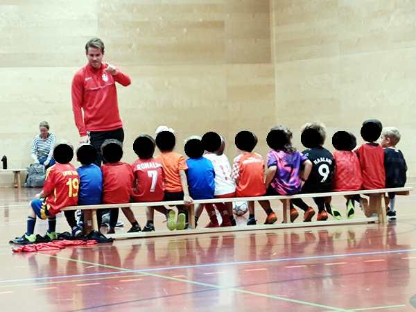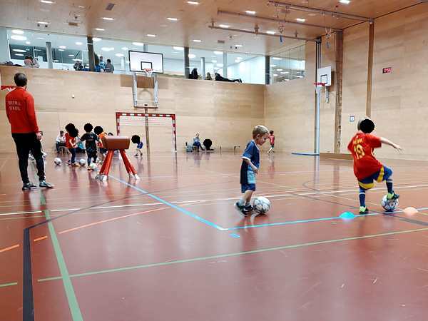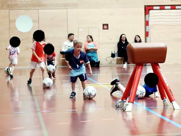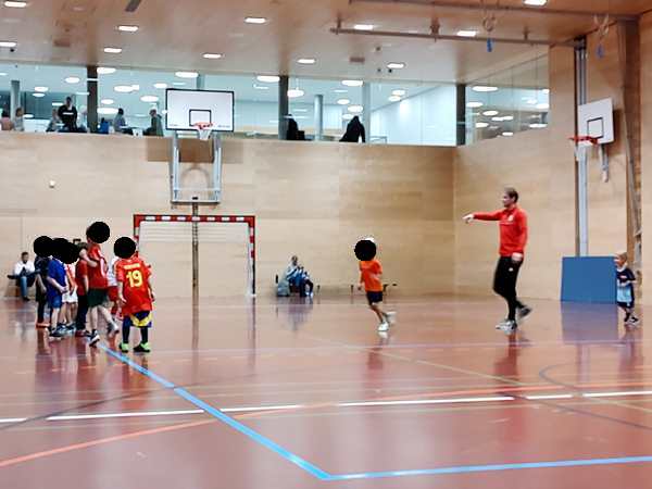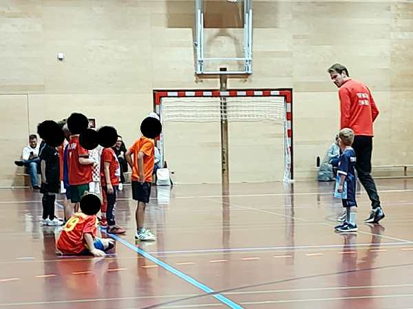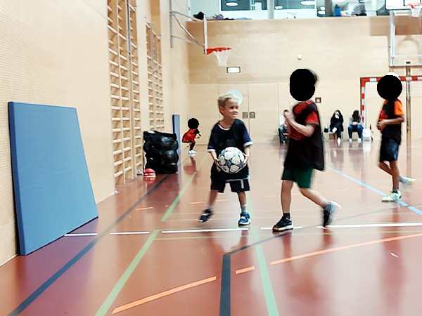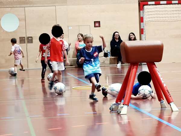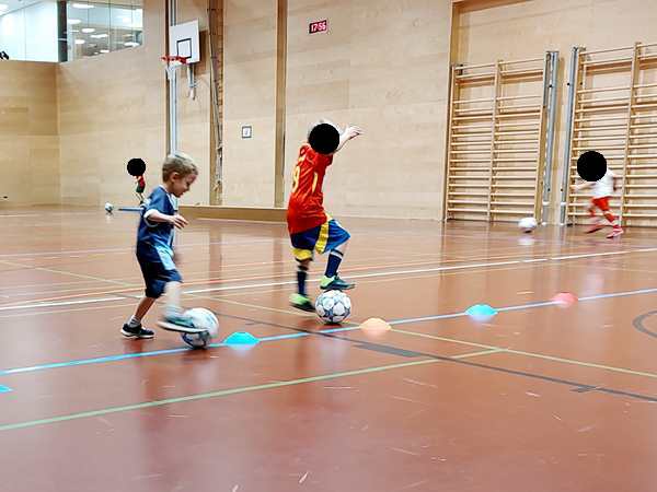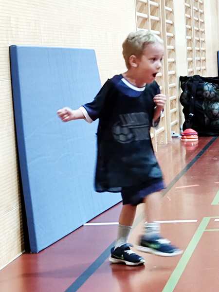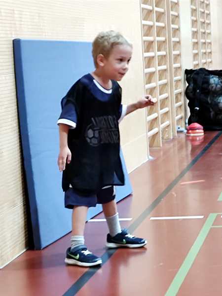 Then the trainer set up a parcours they had to master with their balls. Emmy did well. The second half of the class they always play games. They split them into four teams, and always two were playing against each other. Thankfully Emmy was in the team near me.