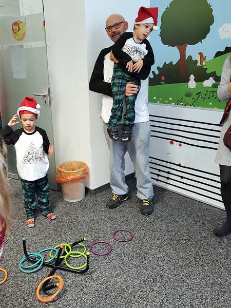 In the next room there were two games. First they got a few rings that they had to throw and try to hit a target with. The other game was to put Rudolph's nose on a board with their eyes covered up.