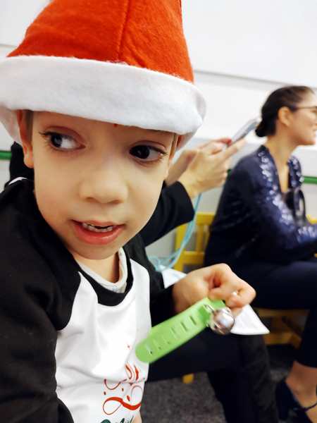 We were again all wearing the tops of our Christmas pj's, so we all had the same shirt on, but this time we all had regular pants on. They had told us what pants the kids were supposed to wear under their costumes, what colors, so that's what they were wearing. We took the subway and were together with a neighbor who also has a son in a wheelchair who goes to the school where Sammy goes to kindergarten. She then also got off where we did and walked to the other subway with us. But there she went the opposite direction. We got on the second subway and rode it to the end.