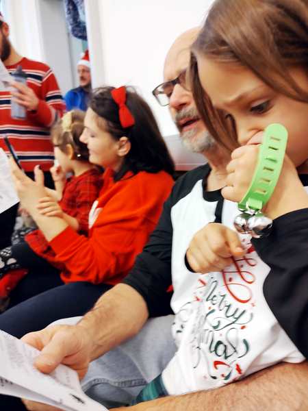 I helped them, especially Emmy, with the glue and bringing the plates with stuff to glue onto their paper plates into reach for them. Rand helped Sammy with his plate. Soon they were done, and we continued on to the next room where they were playing musical chairs. The kids played a few rounds and each won a Christmas hat.