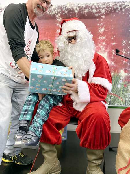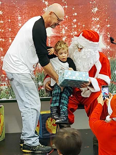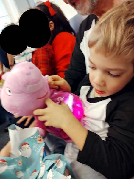 Tammy's name was called next. When she opened it, she didn't know at first what it was. It was a DIY unicorn night lamp. Next was Sammy. He'd been scared of Santa, even before he'd arrived he'd been fearful. Randy carried him to the front and put him on Santa's lap. Back at our seats, Randy helped him open the box, and he was very happy to find Peppa Pig in there. When you push her belly, it lights up and plays songs. Sammy held it tight and carried it around all day until going to bed with it.