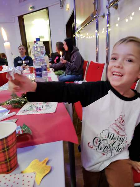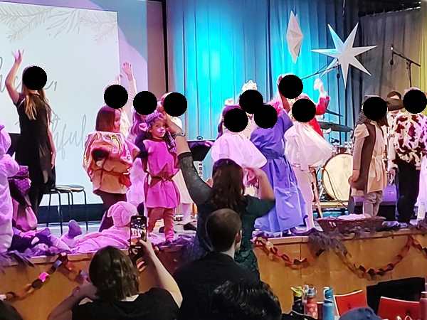 Two people read the Christmas story in English and German, while the kids played what they were reading. Emmy walked on stage with the other shepherds and sheep. Then Randy took Tammy behind the stage so she could do the dance with the others. It worked out perfectly. They then returned to us, as it was time for the kings. Randy carried Sammy, while Tammy ran ahead of him, when she should have walked with them. For some reason there was no third king. Once on the stage, Randy put Sammy down next to Tammy who was kneeling by baby Jesus. And Sammy was doing really great. He had been very cranky for a long time, but then suddenly that crankiness had passed. The cutest thing was when he said hello to Mary, Joseph and Jesus in a loud voice. He said it a few more times, as they didn't respond, and a few people in the room chuckled. Tammy tried to put his hand on his mouth and told him to be quiet, but it didn't work. In any case, it was already time to get off the stage again anyway, and so Randy picked him up and carried him down, and everyone else also walked off the stage.