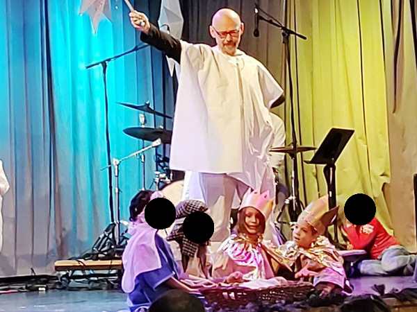 At 4:30 pm we went to the back to get the costumes and put them on. Tammy and Sammy were kings, Magi, and Emmy a shepherd. Randy was going to carry the star, so he also got a white sheet to put on. Then we returned to the sanctuary.