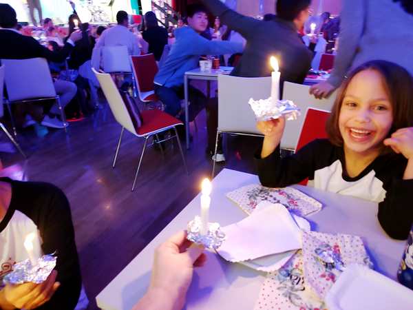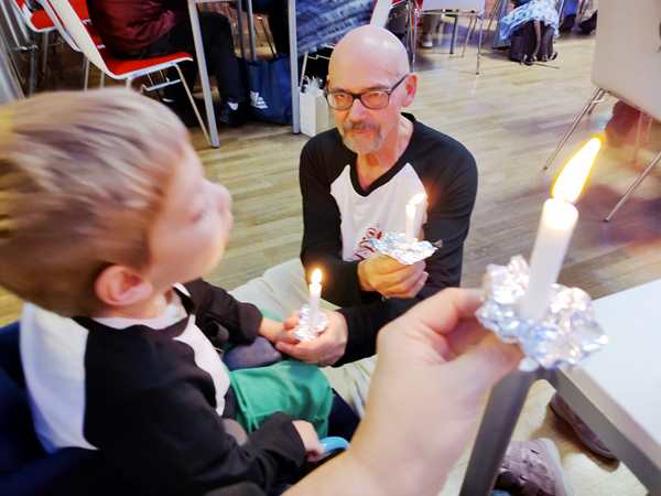 We went straight to the back to take the costumes off. Then we returned to our seats in the sanctuary. The older kids were just finishing part 2 of their play and then did a dance. The pastor then spoke for a few minutes, then we each got to pick up a candle, and the flame was passed on from the first candle in the front to all the other candles in the room. Randy ended up helping Sammy holding his, while Emmy got tired of holding his after a while, so I took it. We held the burning candles for quite a long time while singing "Silent Night" and another song. Tammy was also getting tired of holding it but held it to the end. They were all excited to blow them out.