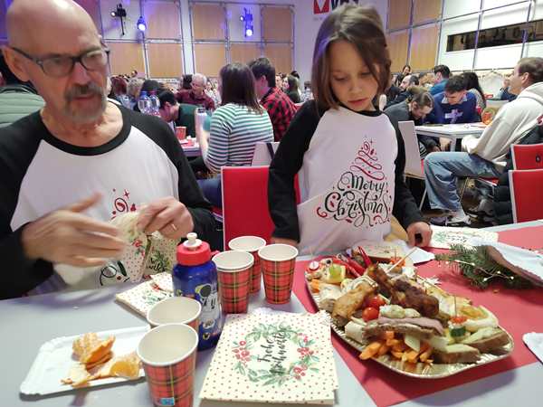 The service then soon ended, and this year we didn't have to go to a buffet to get food, but they carried platters of food to all the tables. It felt like a feast, when they put a huge platter full of different stuff right in front of us. There was nobody at the table right next to us. The kids took food but didn't like it all, then they soon moved on to the dessert platter. We all ate plenty and ate well; it was really good.