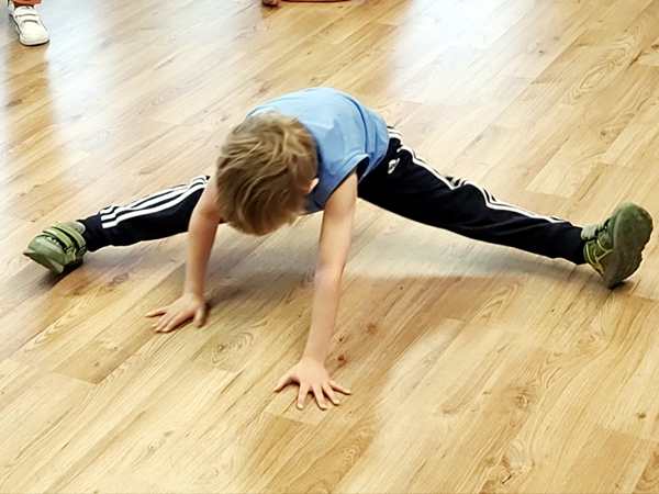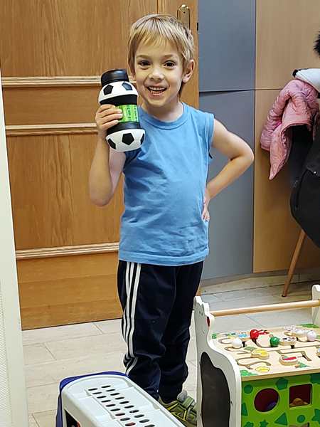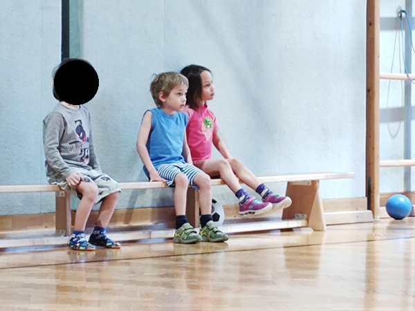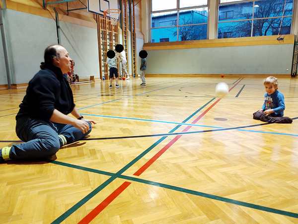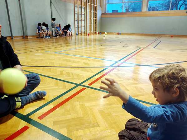 Just before the class ended, I waved Emmy to the locker room, so we could get dressed and leave. The ball-playing class starts at 4:30 pm now, so we have only 15 minutes between classes, which is not much. And so we were the first ones to leave, rode our scooters to the tram stop, then took the tram for 3 stops and rode our scooters to the school, where the ball-playing class is taking place. When we walked into the building, Randy was already there with Tammy and Sammy and getting ready to go inside. We joined them and all walked into the gym together. That included Sammy's friend Michi with his son.