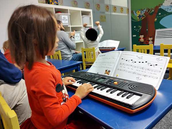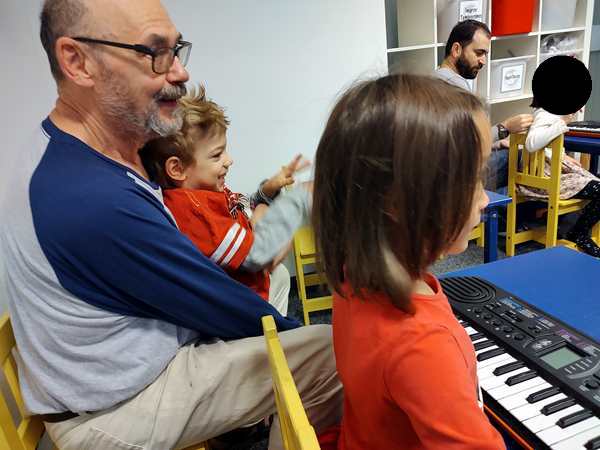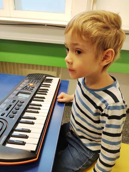 The teacher started the class with the greeting song. Emmy was trying to get the teacher to include Sammy, as the parents and the teacher himself were included, but he didn't, when their previous teacher had done so. Emmy had told me that he'd behave well tonight, but from the beginning he didn't. The reason was that the teacher played everything way too slowly, so it was all too easy and too boring for Emmy. The teacher did all the songs they've had this semester, but he started with singing the song first, then singing the notes, then playing it with the right hand, then playing it with the left hand, and only then playing it with both hands. Emmy was whining and refusing to play and trying to sit in my lap. At one point I even sent him out of the room as he was disturbing the other kids.