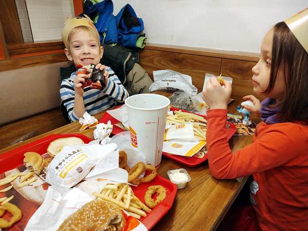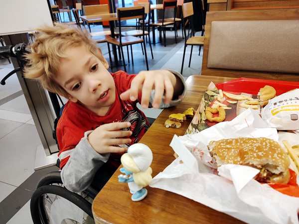 When we got off the subway, the only elevator was broken. So we had to take the escalator, and Randy first carried Sammy up, then went back down to bring up the wheelchair. Then we walked to the Burger King there instead of McDonald's, as McDonald's has toys we don't like right now. Burger King is not as good as McDonald's in Austria, but it was better today, though more expensive. And they had good toys, pretty big Smurfs. The kids also enjoyed the crowns, and the onion rings.