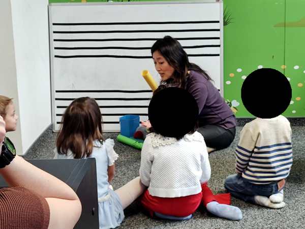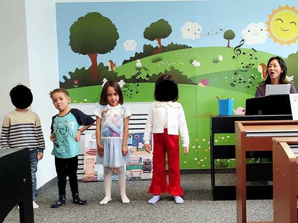 It was a warm and sunny day. We took the subway downtown, then walked to the music school, where we arrived early. At 10:30 their class started. The teacher did the greeting song, then did the breakfast food guessing game again. Next she had them do a finger exercise in the air, fingers touching the thumb, then they did the finger exercises on the piano. Next they did the song they're playing now.