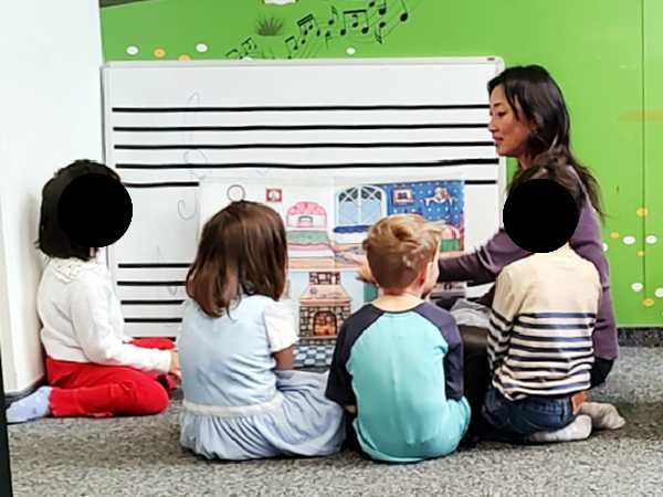 They then did an exercise in their books, where they had to mark skips and did well. Then it was time to sing their song up front, and they did well. Then it was story time, which they enjoy. I was surprised that the teacher went 10 minutes over, but then we had not started on time either. The kids got their stickers and stamps for their homework. They had practiced 6 days of the week, every day. She did the good-bye song, then the class was over. We got dressed and left.