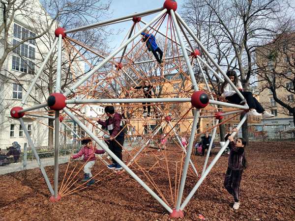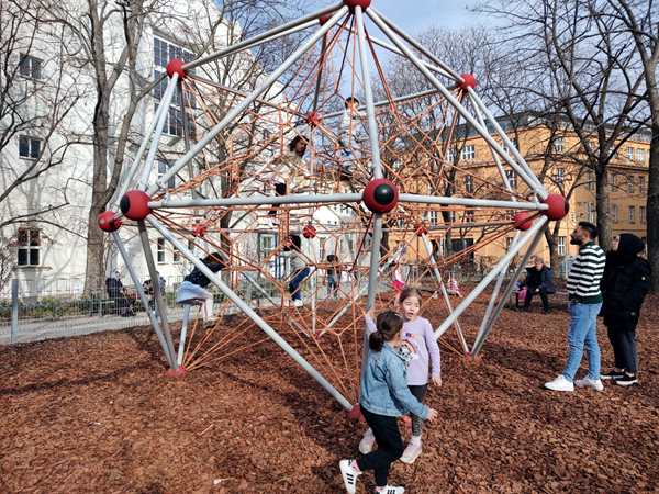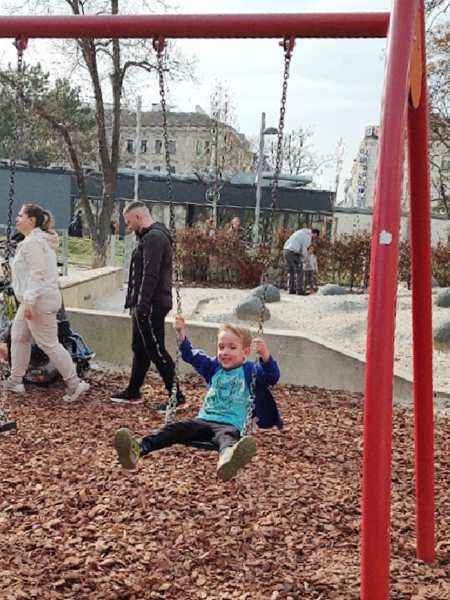 Sammy was ready to leave, so we already left at 12:45 pm, an hour before their swim class was to start. We crossed the square, walked into the pool building and bought our tickets. Then we walked around the building to the wheelchair entrance, where they let us in. We got changed and walked inside. We still had plenty of time until the class at 1:45 pm, so we all went into the warm baby pool. Tammy and Emmy had their diving goggles and had lots of fun. Sammy also had great fun. Emmy did somersaults backwards in the water, and Tammy somersaults forward. Both tried to do handstands in the water.
