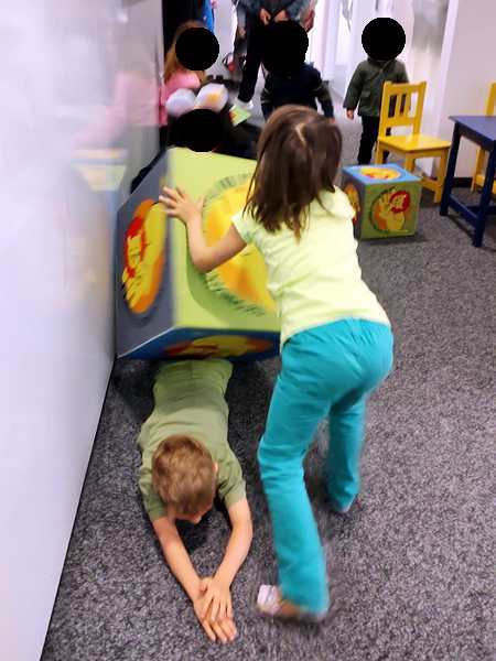 Day 2028. This morning the kids kept coming to me, keeping me from sleeping. At 9:30 my alarm went off, and I got up and got ready to leave the house. Just before 10 am I left with Tammy and Emmy. We took the subway downtown, then walked to the music school. It was raining and it was cold. We got there a few minutes early, and the kids started playing with the cubes, even though there were only a few there today. When another girl from their class arrived, she joined them in the fun.