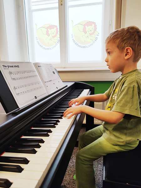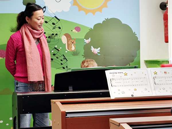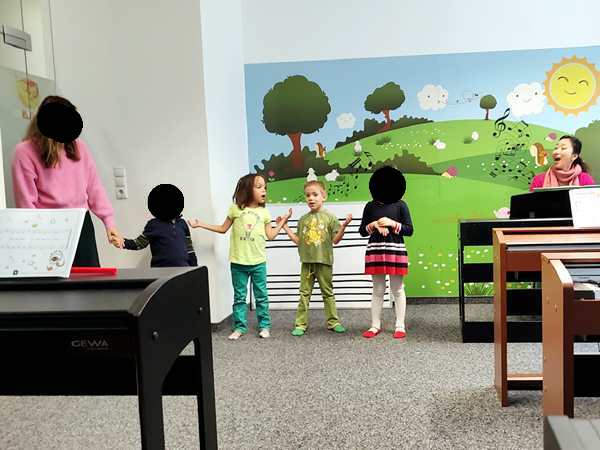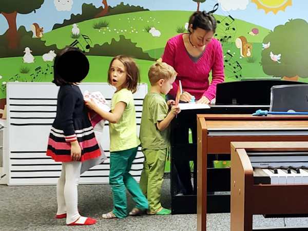 The teacher started with the greeting song, then she did a new guessing game. It was about guessing what everyone was doing after class. The kids were having fun. Then they had to do the finger exercise, touching their thumbs with each finger, one after another, then they played the finger exercises on the piano. Next they did shining stars. Then she asked who wanted to play it up front, and the three regular kids did. Tammy went first and played and sang it nearly perfectly. Emmy went next and also played it well. The other girl came next and did a decent job.
