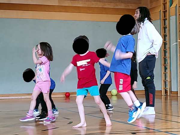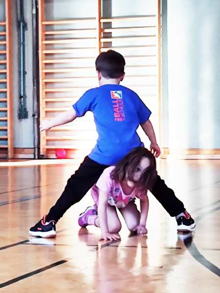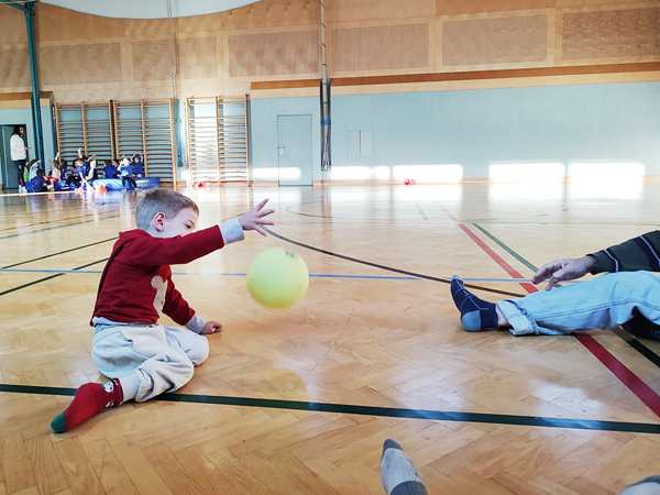 Today all the parents were sitting on the other side of the gym as the sun was coming in through the windows and would have blinded us. Sammy's friend Michi wasn't coming, so Randy and I were playing with him. We weren't just playing ball, but I was holding the ball with my legs and telling Sammy there was no way that he could get it out, but of course he always could. He was having lots of fun and doing lots of laughing. Tammy and Emmy were also having fun, even though Tammy got hurt by the same boy several times. They were playing some fun games.