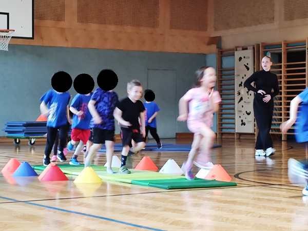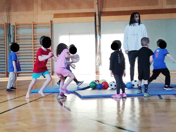 We rode our scooters to the tram stop and got on. After three stops, we got off and rode our scooters the one stop to the school where their ball-playing class was taking place. Randy and Sammy arrived at the same time we did. We went inside, the kids got changed, then we went inside the gym.