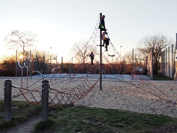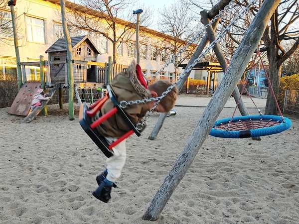 At 5:30 pm the class was over. They got dressed again, and we left. As there was still time until the 5:53 pm bus, they stopped at the playground and climbed all the way to the top. Sammy wanted to swing, and I pushed him. Tammy also came by briefly, then climbed up to where the slide was. Then we left and walked to the bus stop. It was time for them to eat their sandwiches.