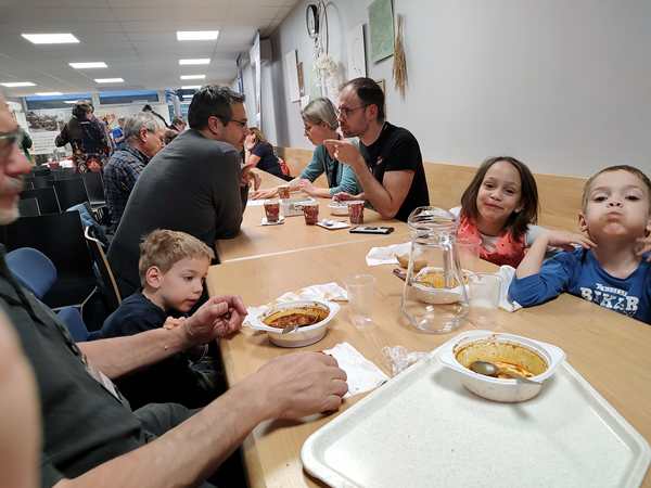 At 5:30 pm we were getting ready to leave the house. We got into the car and drove the 5 minutes to the church, where the missions conference was starting tonight. We walked in, got our welcome packet, and were shown where our table was. Then we went to the where everyone was eating and got dinner for all of us. We found a place to sit down and enjoyed the gulash soup. The kids started talking with the people around us, and there was someone we knew well we briefly talked to.