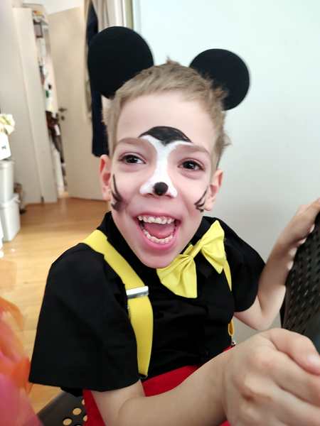 We had tickets for a carnival party - the last one - that we needed to leave for at 1 pm. It was very clear that Emmy was not up for it, so he and I were going to stay home. Sammy was so very excited to put his new Mickey costume on for the first time. I helped with him, and also helped Tammy get ready. I did her hair and her face, then I did Sammy's face. He looked so good in his new costume!